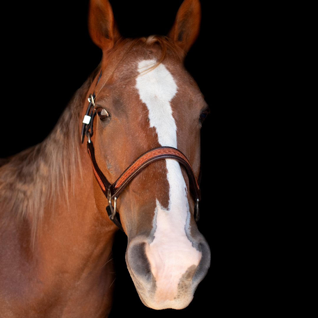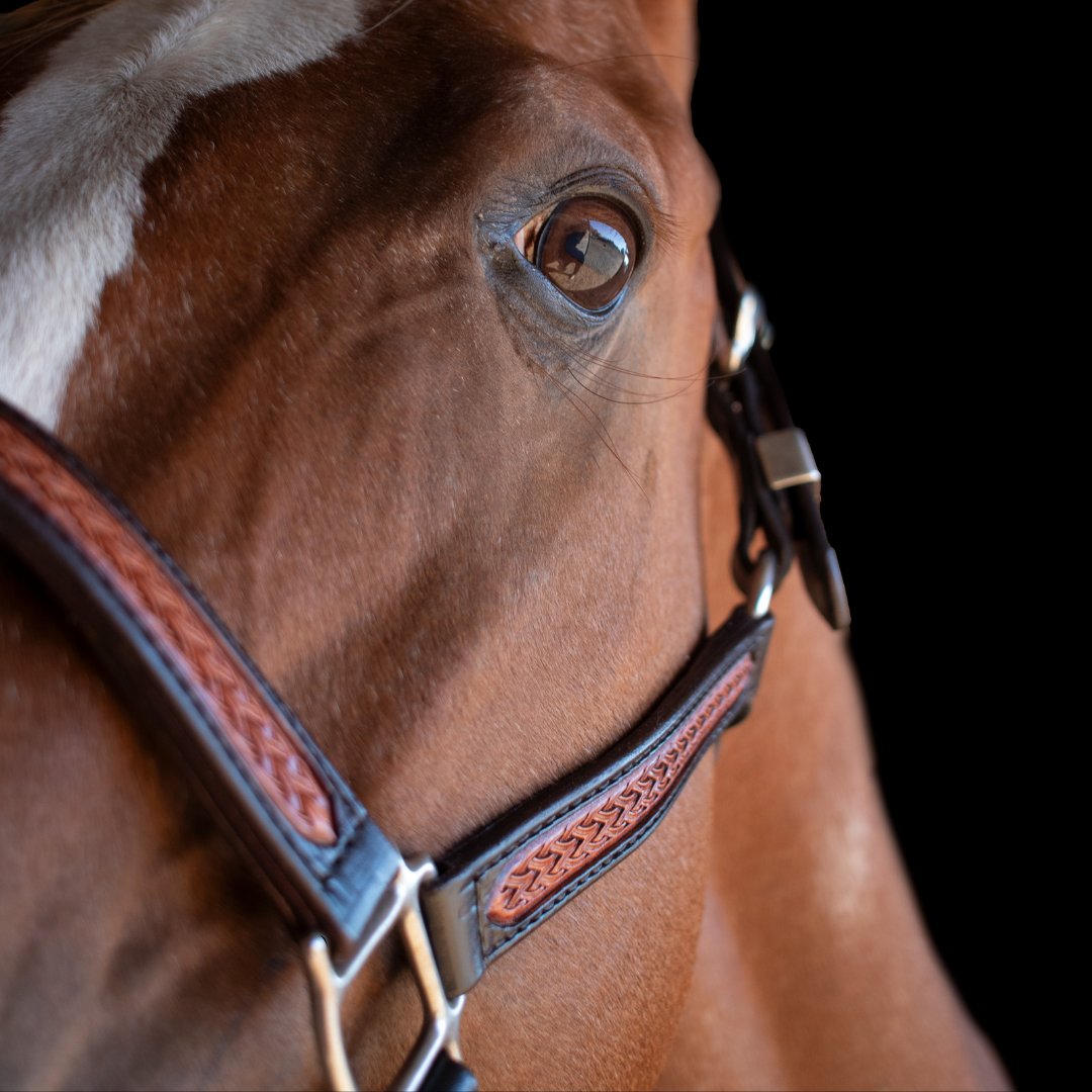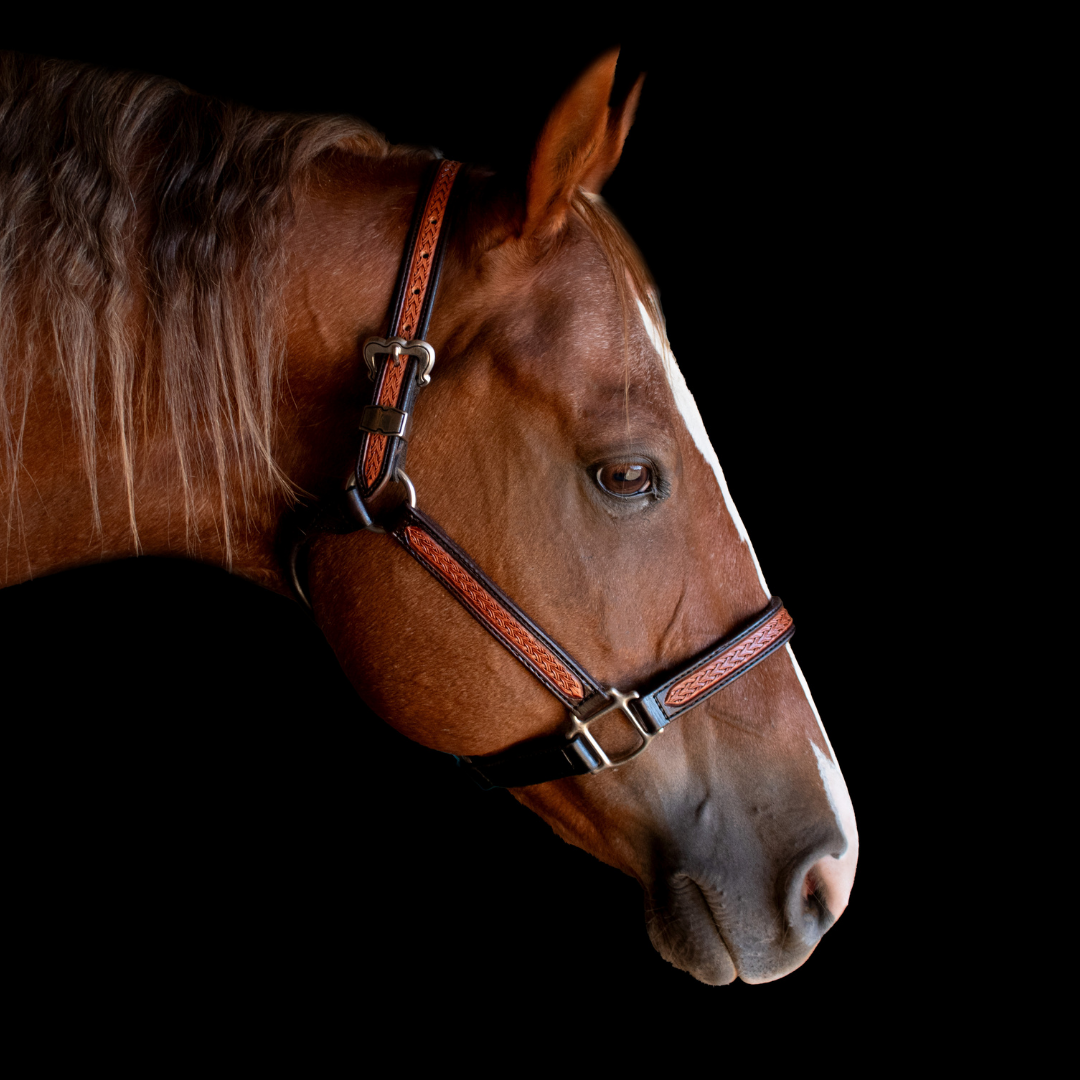 Small Check Lace Tooled Halter with chocolate dyed background and stainless hardware.