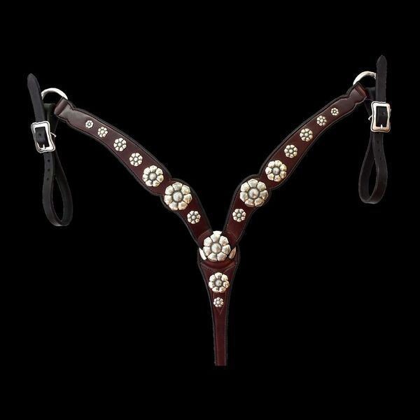 This beautifully shaped Bordeaux breast collar features striking floral Mincer conchos, paired with the craftsmanship and finish you expect from Joey Jemison Custom Leather. This combination creates a truly one of a kind style, guaranteed to set you and your horse apart from the others.