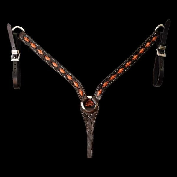 This very eye catching and sleek breast collar features a bold large diamond stamp and the unmistakable two tone look. You know instantly this is a fine piece crafted by Joey Jemison Custom leather. This breast collar falls elegantly over the point of the shoulder.